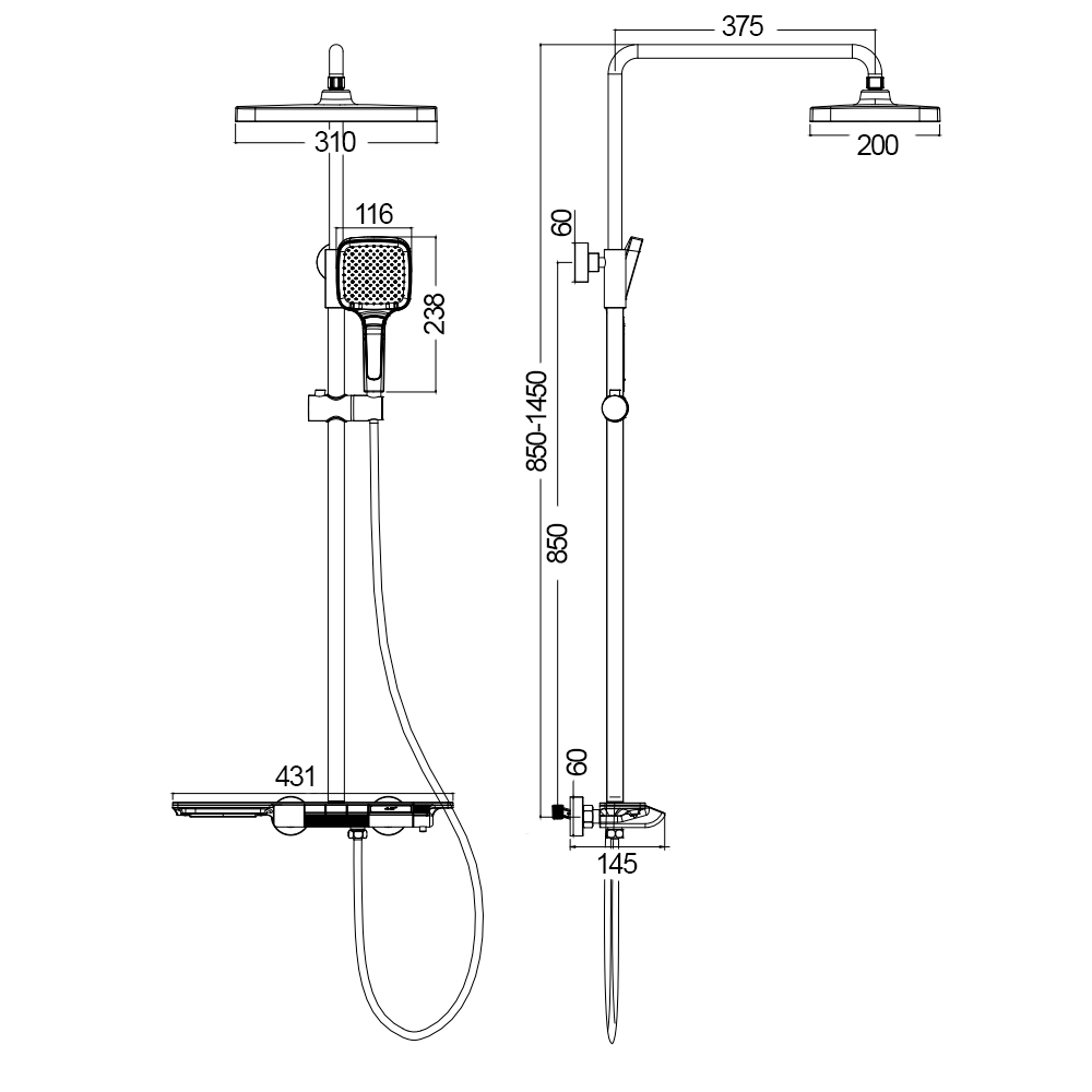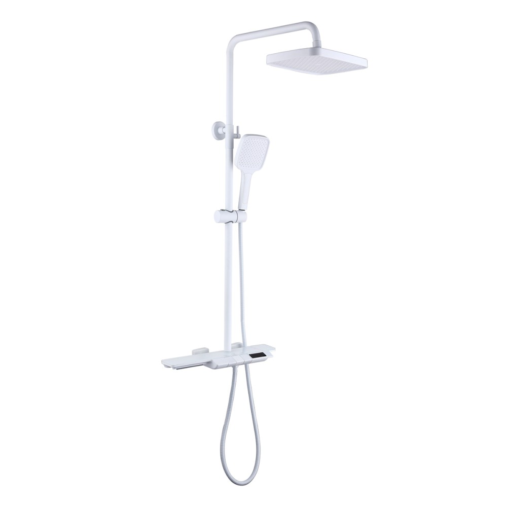 - Состав: термостатический смеситель, душевая штанга, верхний душ, душевая лейка,