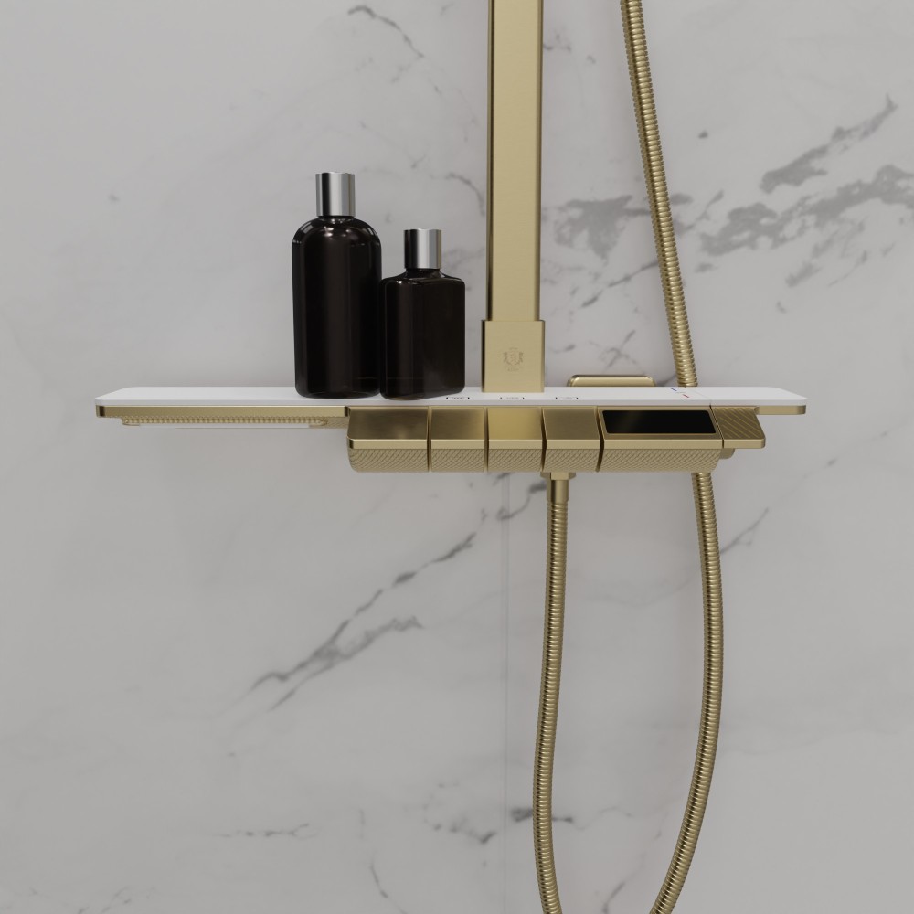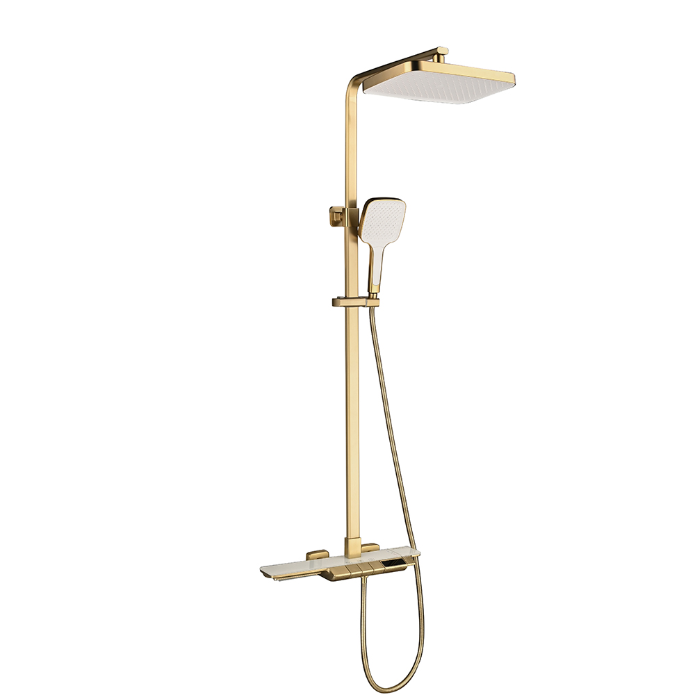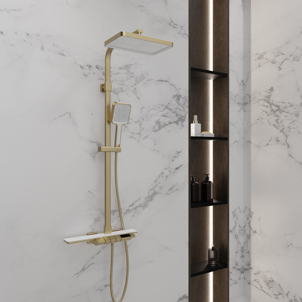 - Состав: термостатический смеситель, душевая штанга, верхний душ, душевая лейка,
