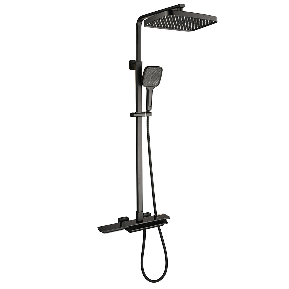 - Состав: термостатический смеситель, душевая штанга, верхний душ, душевая лейка,