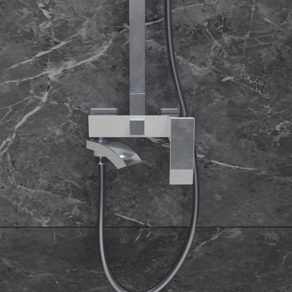 - Состав: смеситель, душевая штанга, верхний душ, душевая лейка, держатель, шланг