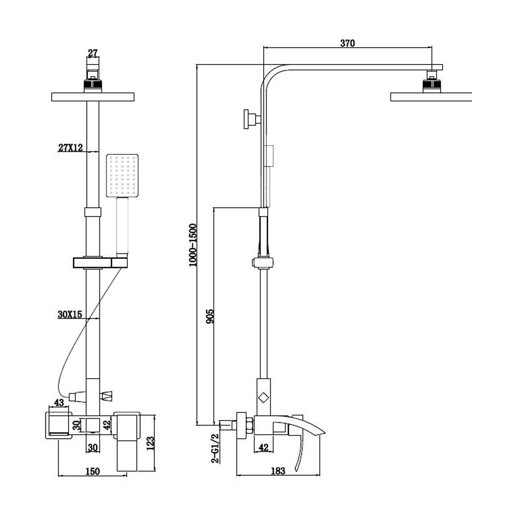 - Состав: смеситель, душевая штанга, верхний душ, душевая лейка, держатель, шланг