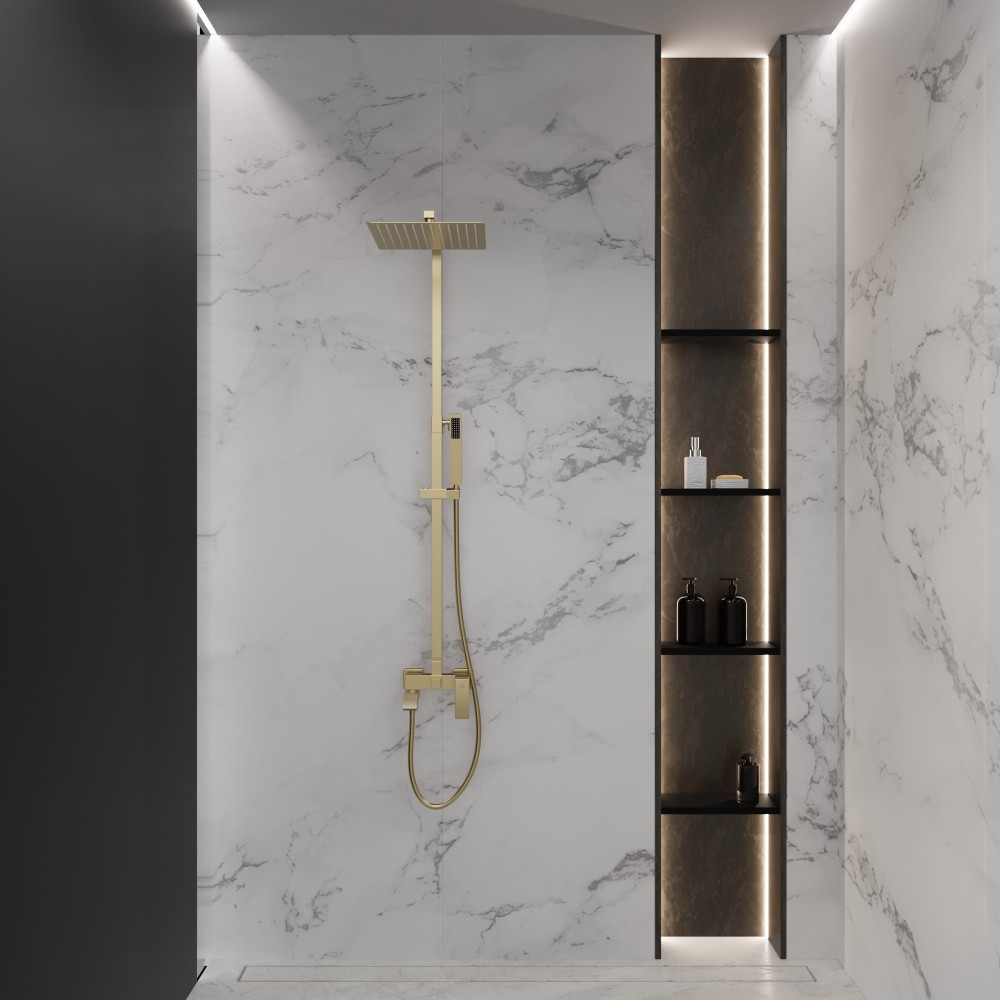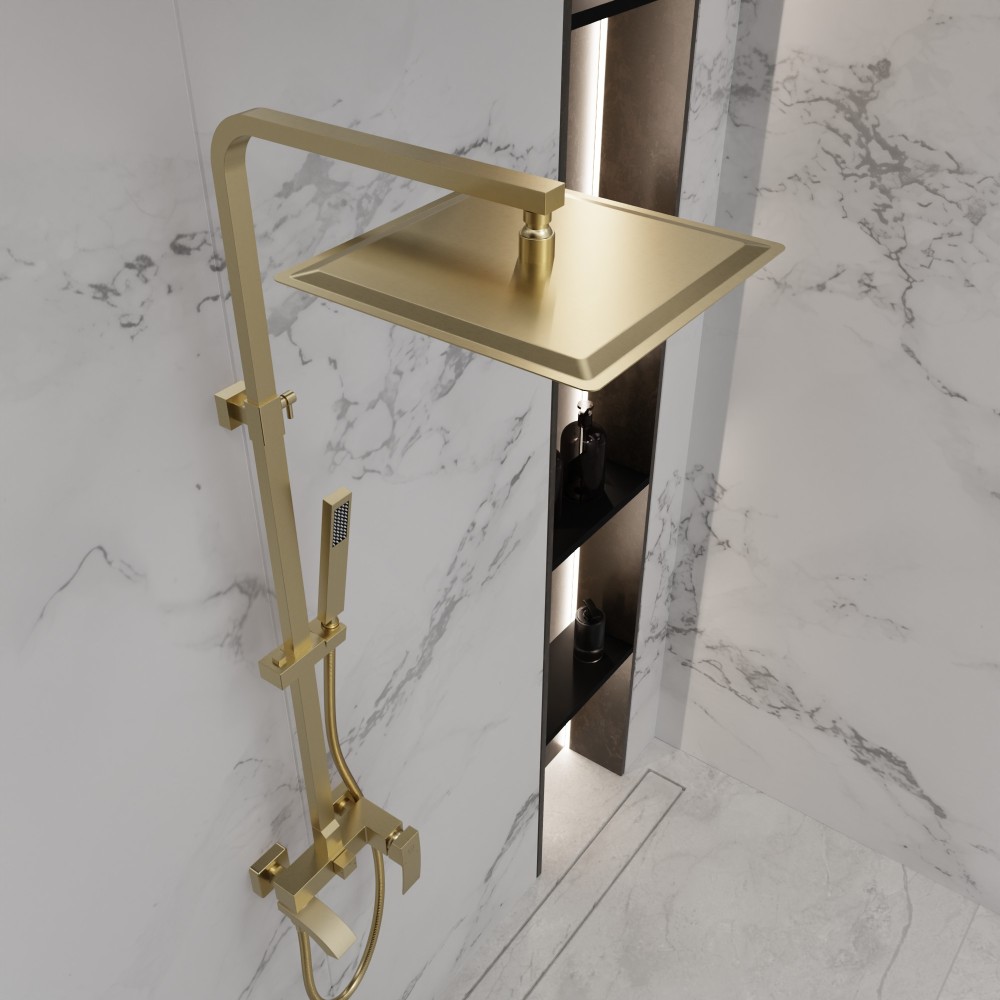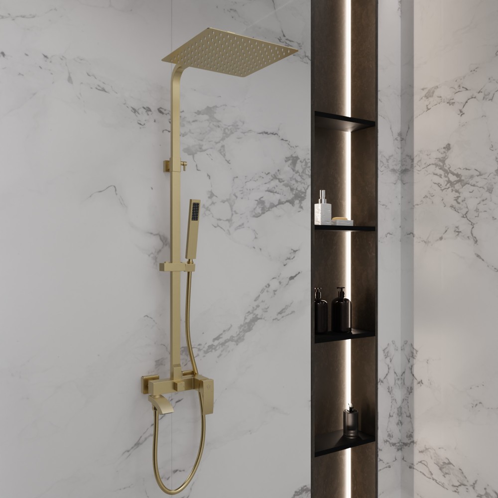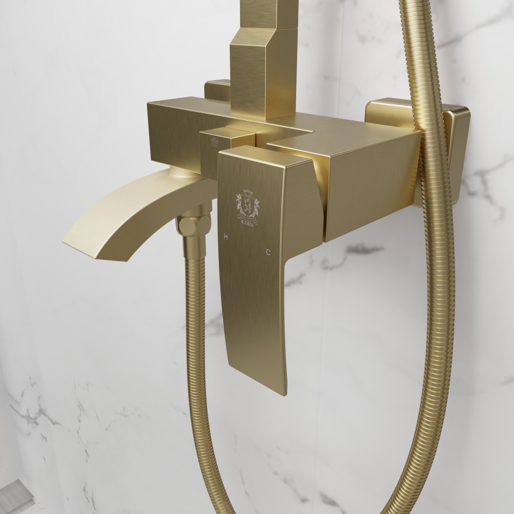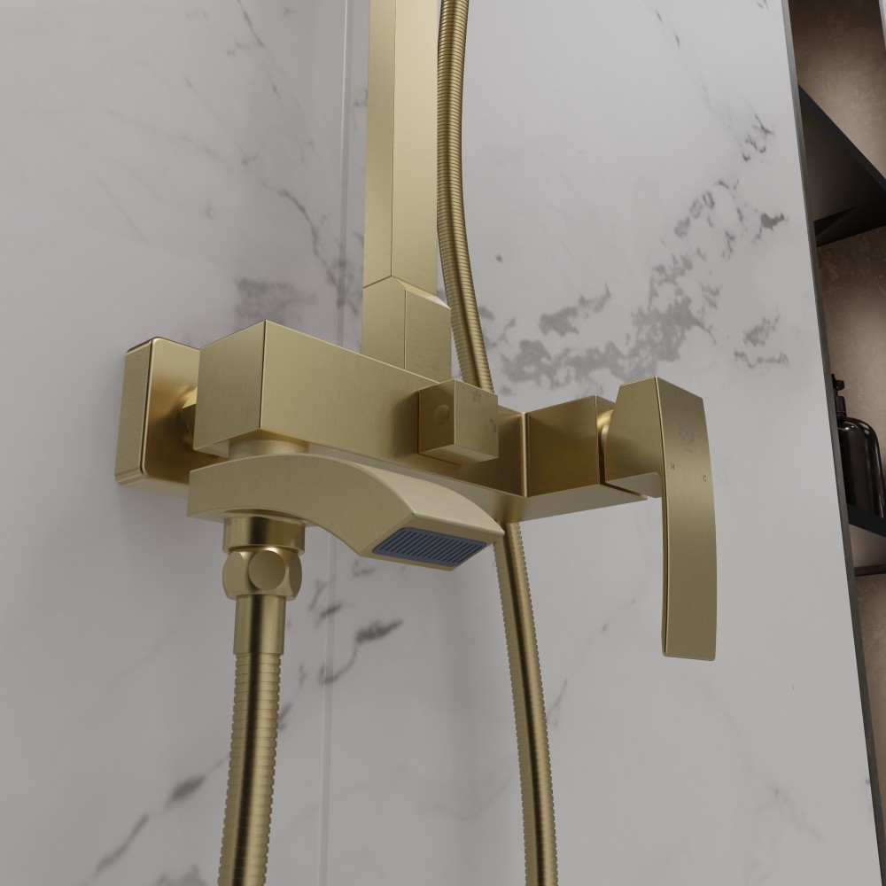 - Состав: смеситель, душевая штанга, верхний душ, душевая лейка, держатель, шланг