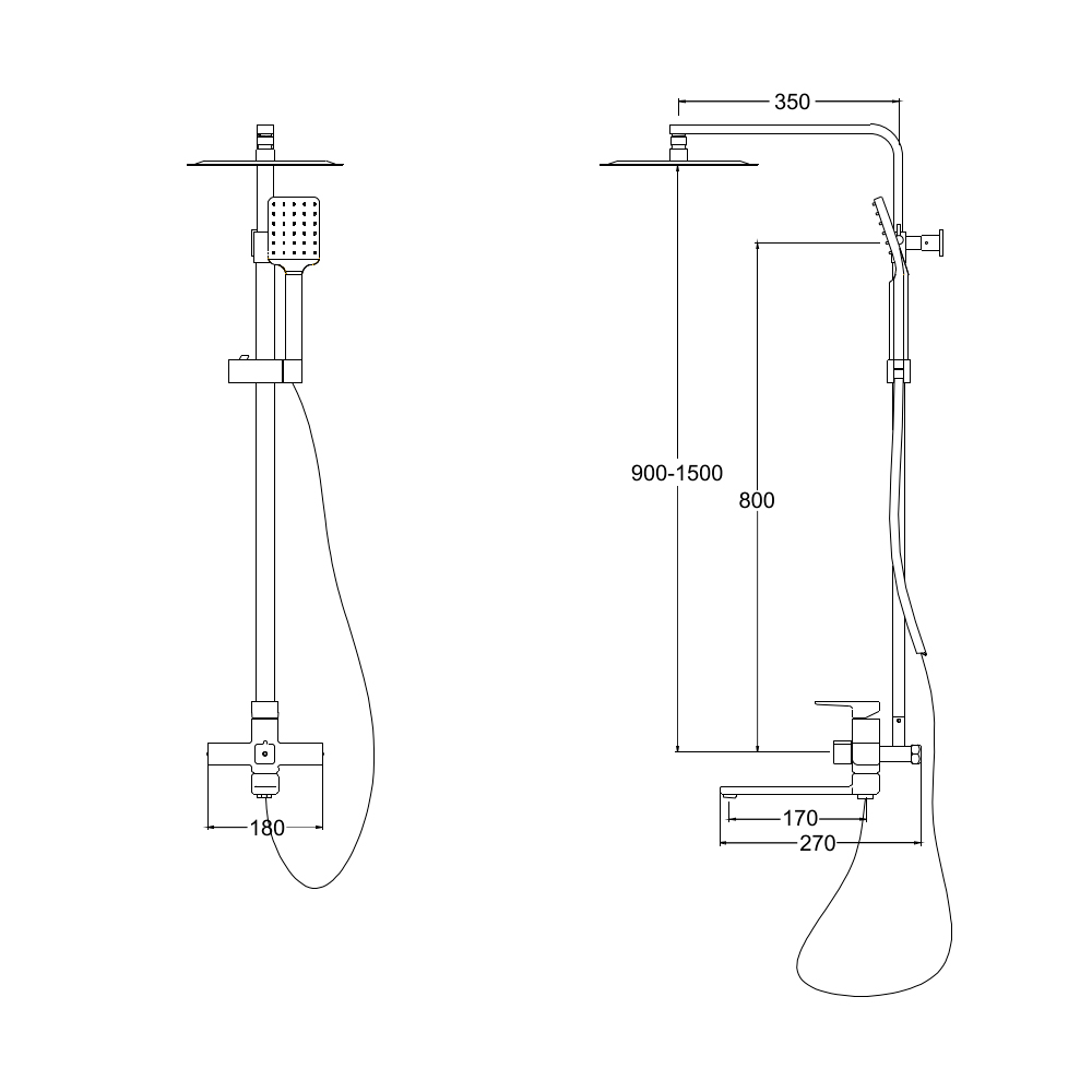 - Состав: смеситель, душевая штанга, верхний душ, душевая лейка, держатель, шланг