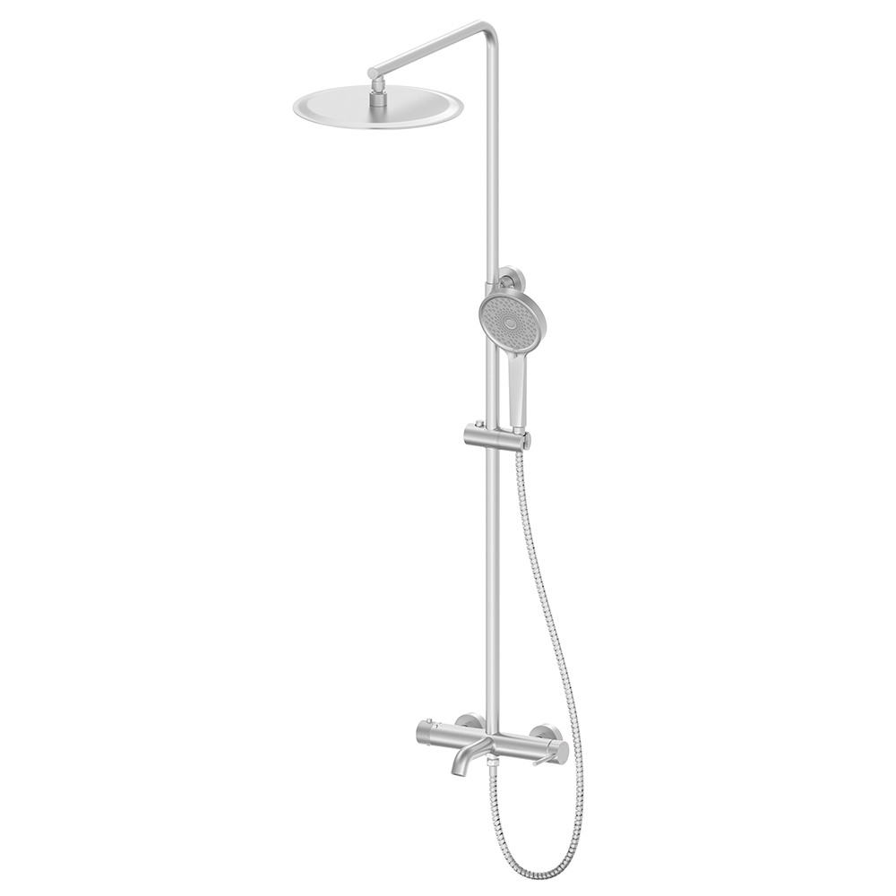- Состав: смеситель, душевая штанга, верхний душ, душевая лейка, держатель, шланг