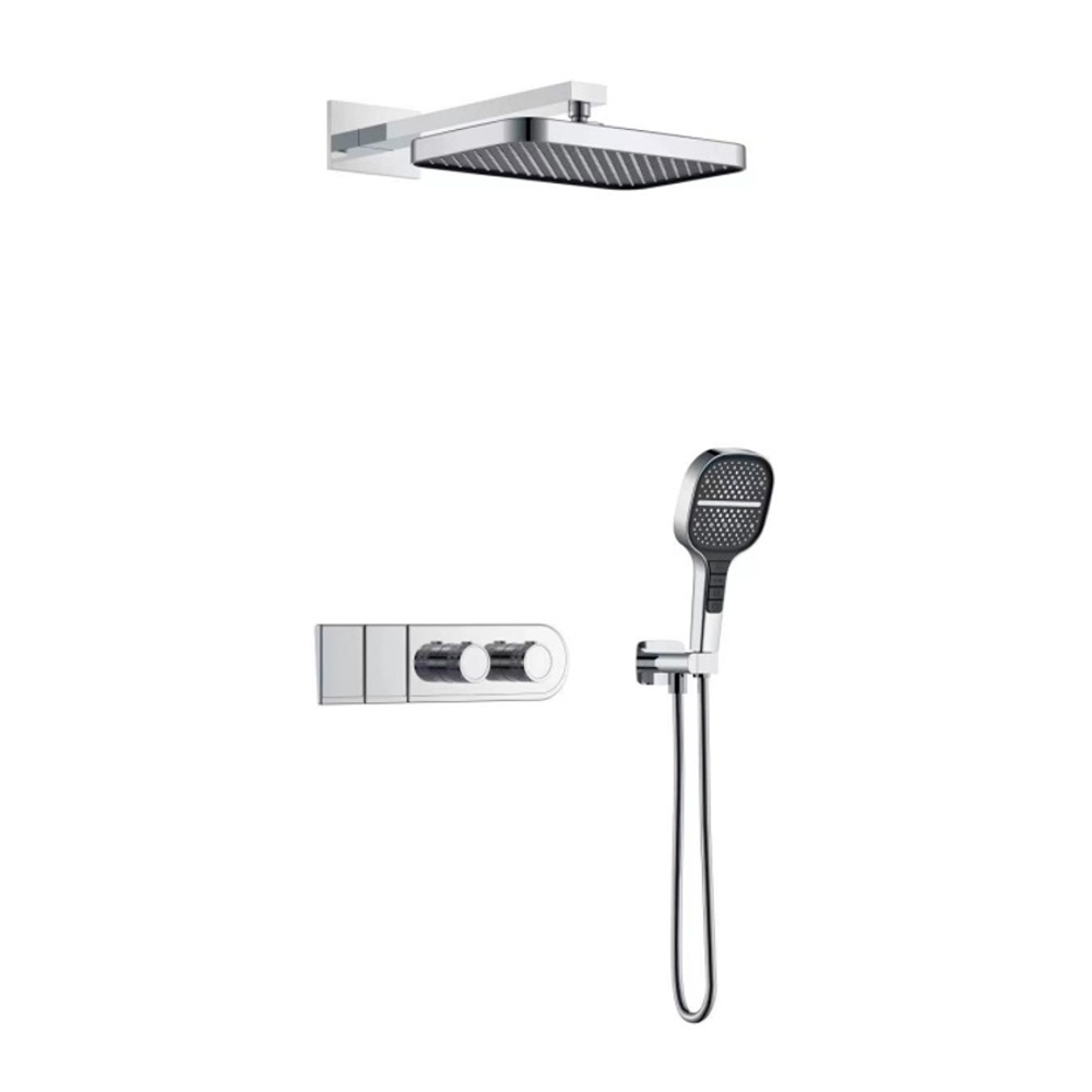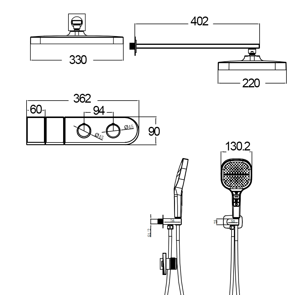 - Состав: термостатический смеситель, скрытая часть, душевой кронштейн, верхний душ,