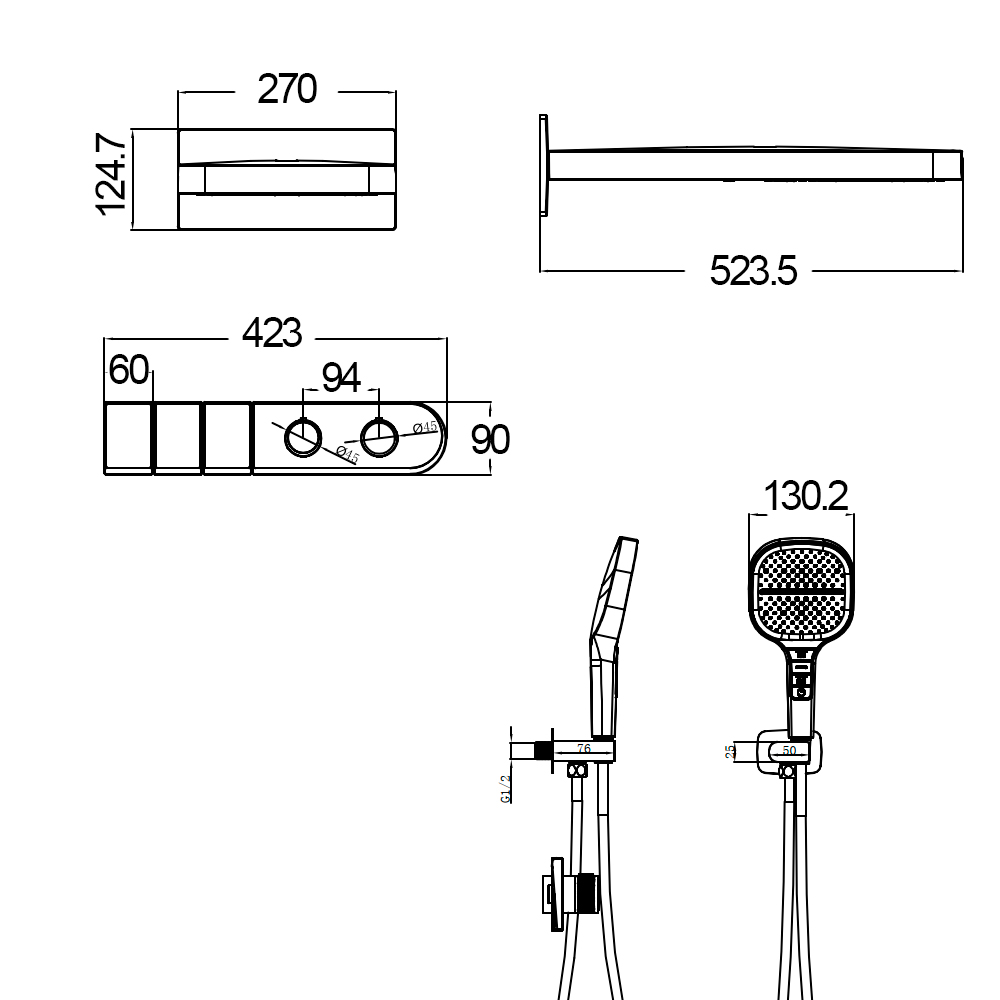 - Верхний душ 523,5x270 мм, 2 режима (Дождевая, Водопад)