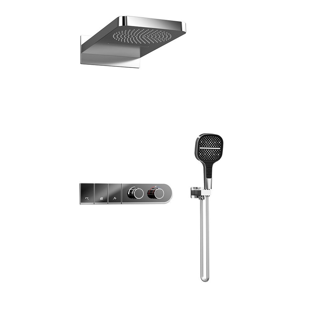 - Состав: термостатический смеситель, скрытая часть, душевой кронштейн, верхний душ,