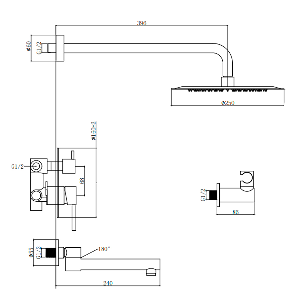 - Состав: смеситель, скрытая часть, душевой кронштейн, верхний душ, душевая лейка,