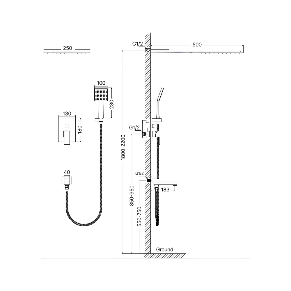 - Верхний душ 500x250 мм, 1 режим