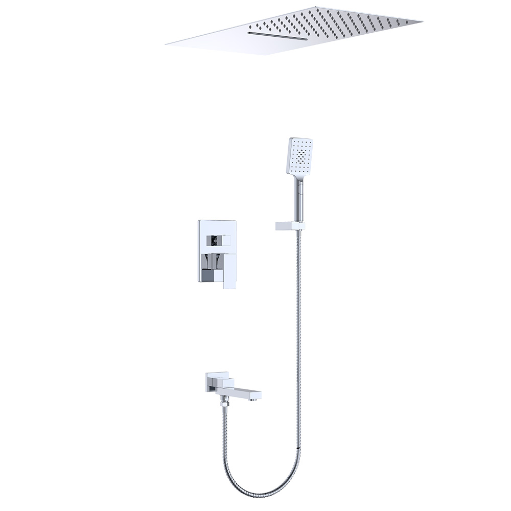 - Состав: смеситель, скрытая часть, душевой кронштейн, верхний душ, душевая лейка,