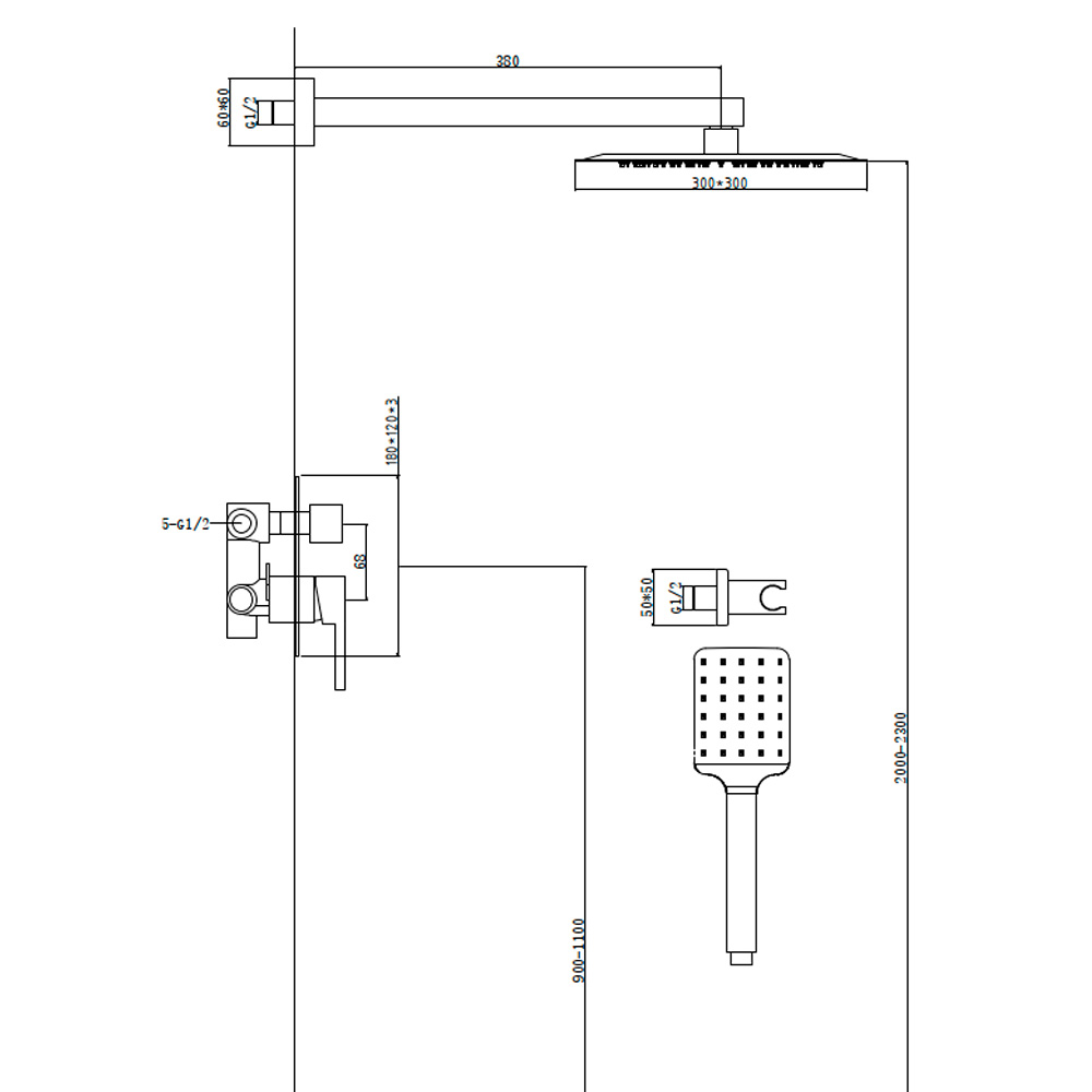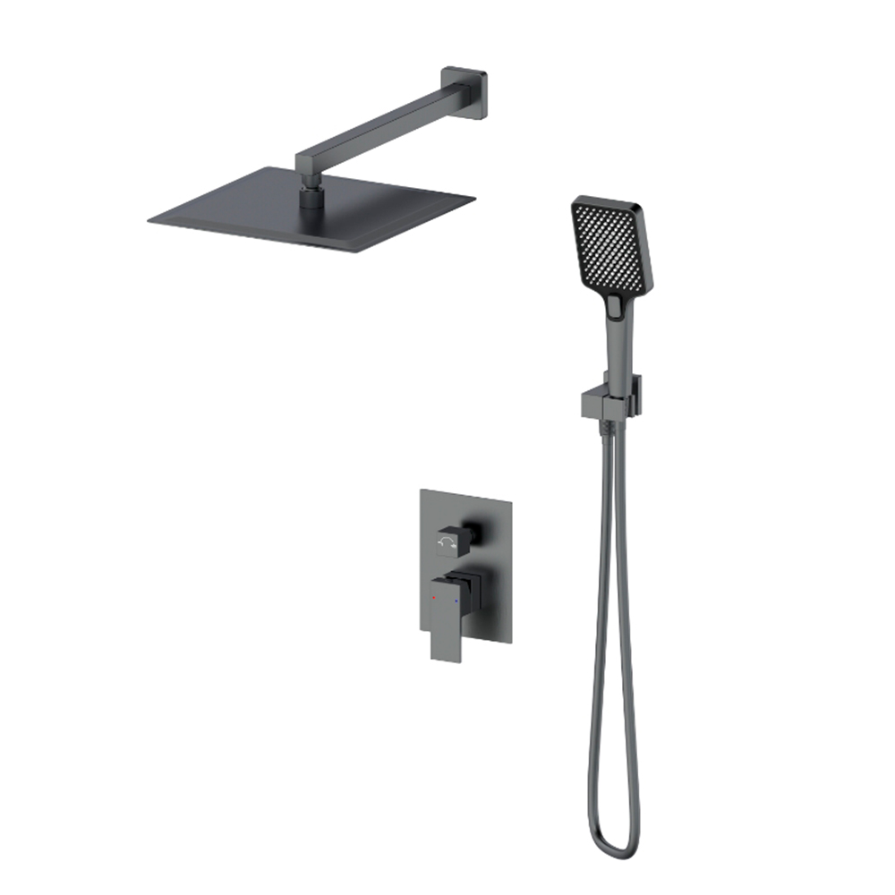 Состав: смеситель, скрытая часть, душевой кронштейн, верхний душ, душевая лейка, держатель, шланг, шланговое подключение