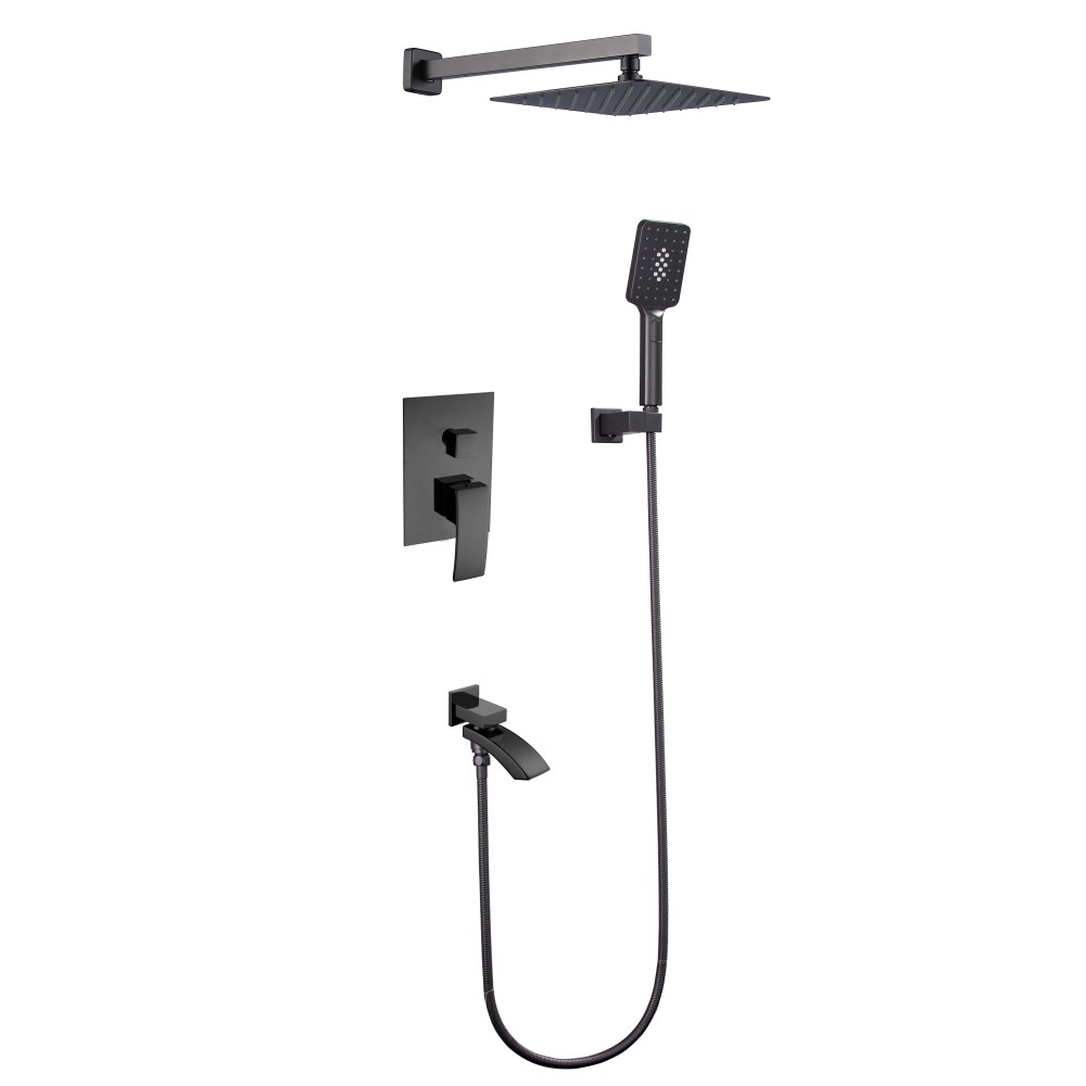 - Состав: смеситель, скрытая часть, душевой кронштейн, верхний душ, душевая лейка,